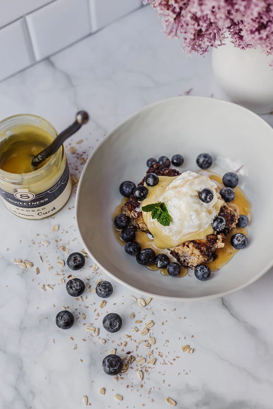 Each square gets a generous dollop of whipped vanilla maple cream that oozes into the warm oats, and topped with a spoonful of lemon curd for a little pop of tart brightness. It is sweet, buttery, and just tangy enough to keep you going back for another bite…or two…or three.