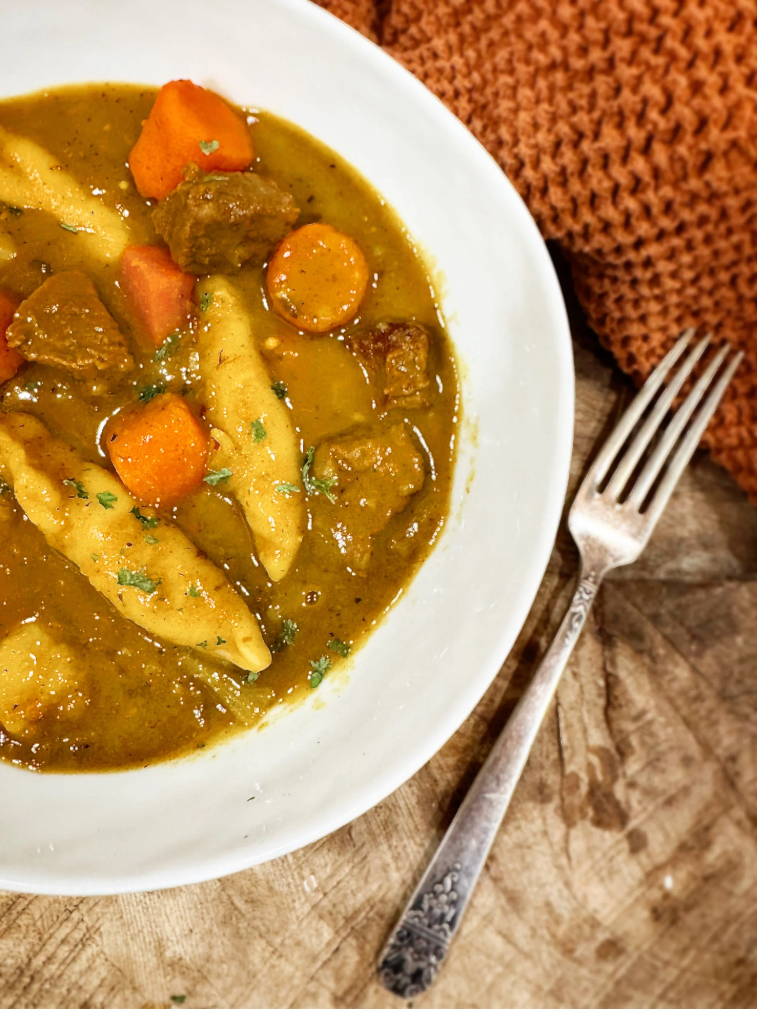 My version of Jamaican Curried Beef & Spinners brings back some of my favorite childhood memories! 🌿🥘 My childhood pastor was Jamaican as are some of our best friends. Always hearty and packed with deep flavour, many Jamaican dishes have become family favourites. This dish is often requested by my family and has tender beef, hearty veggies, and dense, chewy spinners that soak up all the delicious curry gravy…pure comfort in every bite.
