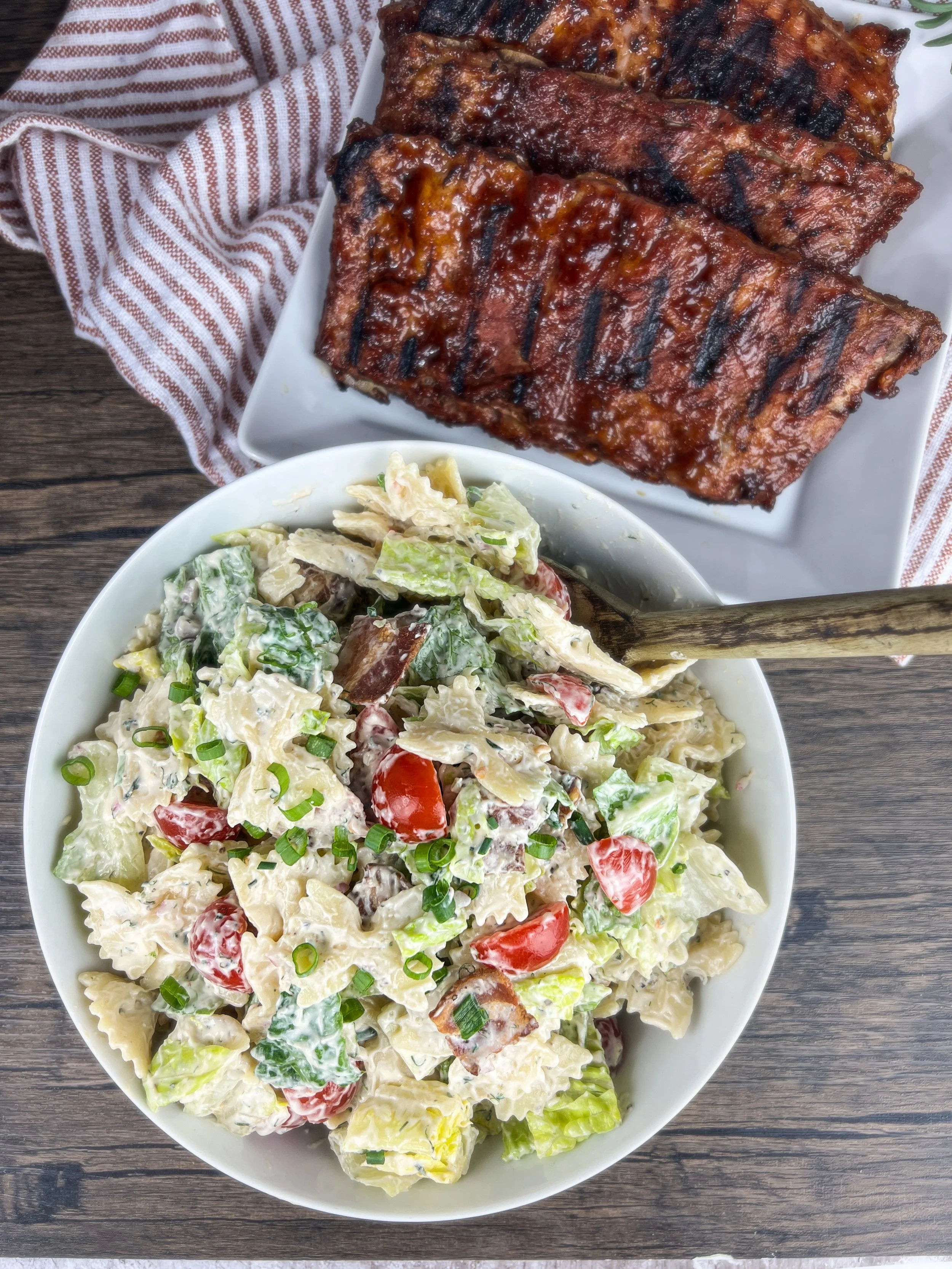 We grill a lot during the spring and summer months. Like A LOT! In my humble opinion, bacon makes everything better so this salad is right up my tastebud alley. The creamy dressing is the perfect compliment to the bacon, lettuce, tomato and pasta that makes up this perfect and hearty salad for your family bbq’s, potluck dinners, picnics, Etc.