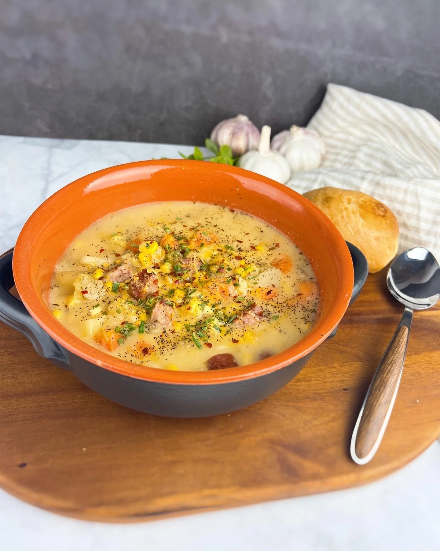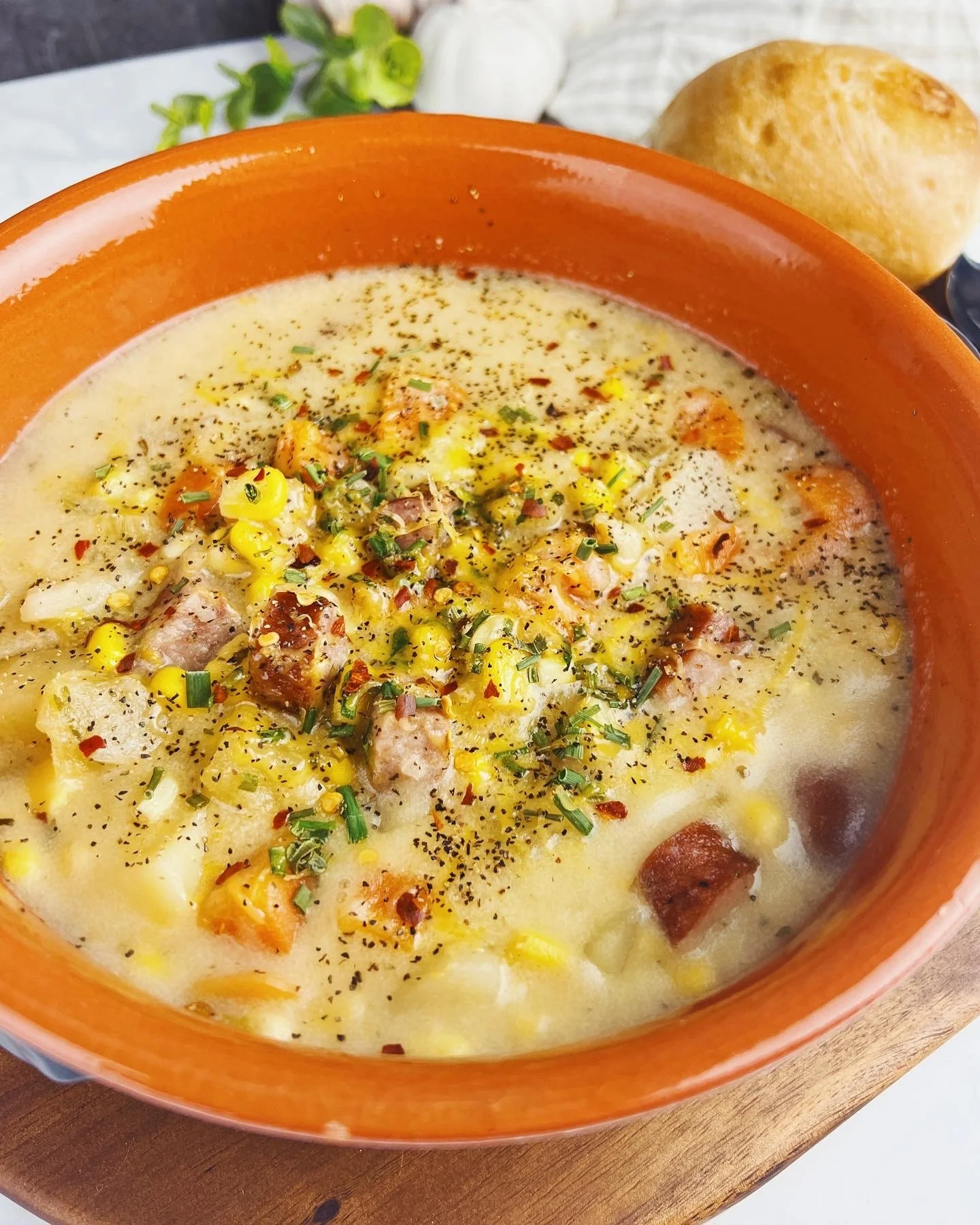 This Cajun seasoned Sausage Potato & Corn Chowder is loaded with smoked sausage, potatoes, & veggies all swimming in a flavourful and thick cheesy broth. Comfort food at its best, especially paired with soft buns or thick slices of HOMESTYLE bread slathered with butter for dipping into the soup.